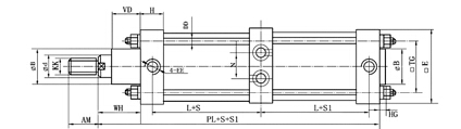 QGBⅡ-C系列為三位氣缸前后兩活塞桿單獨分開。當前缸行程(S)大于后缸行程(S1)時,前端活塞桿頭有三個位置。