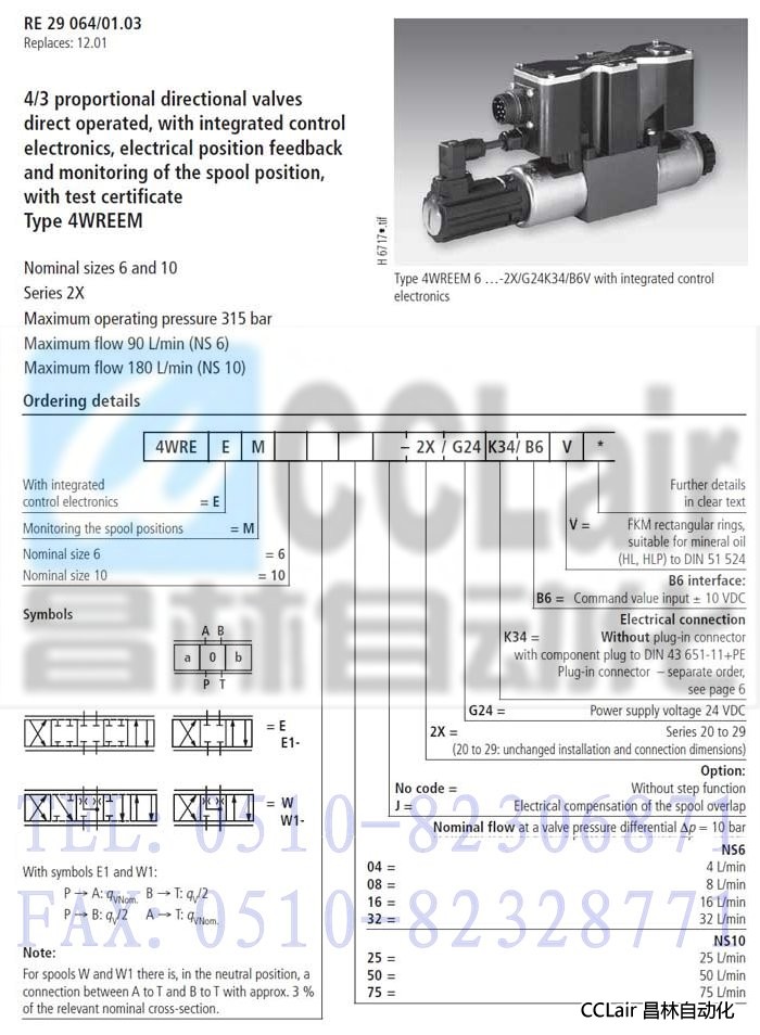 4WREEM10E1-75-2X/G24K34/B6V,4WREEM10E1-50-2X/G24K34/B6V,,比例方向閥,力士樂REXROTH,德國力士樂
