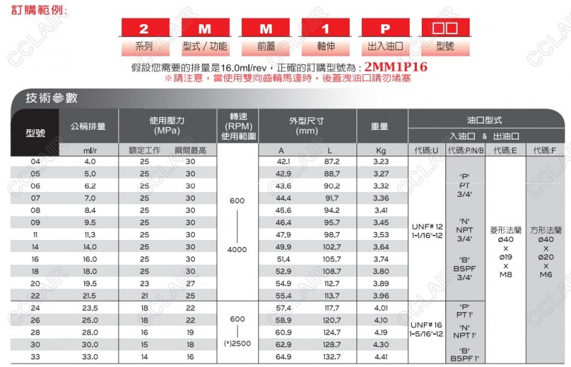 備注:1、假設(shè)您所要的前泵排量是16.0ml/rev,正確的訂購型號:2MM1P16。