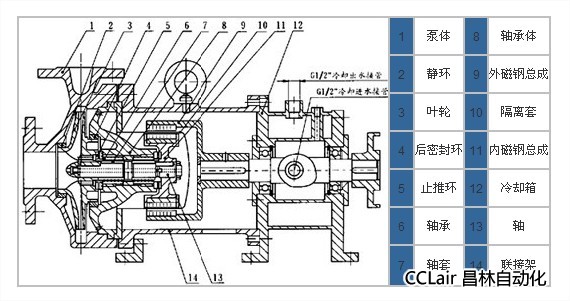 CQB-G型高溫磁力驅(qū)動(dòng)泵(簡稱高溫磁力泵)通常由電機(jī),磁力耦合器,水冷卻裝置和耐腐蝕離心泵四大部分組成,其主要特點(diǎn)是利用磁力耦合器傳遞動(dòng)力。當(dāng)電動(dòng)機(jī)帶動(dòng)磁力耦合器的外磁鋼旋轉(zhuǎn)時(shí),磁力線穿過間隙和隔離套,作用于內(nèi)磁鋼上,使泵轉(zhuǎn)子與電動(dòng)機(jī)同步旋轉(zhuǎn),無機(jī)械接觸地傳遞扭矩。在泵的動(dòng)力輸入端,由于液體被封閉在靜止的隔離套內(nèi),沒有動(dòng)密封因而無泄漏。磁力耦合器的磁性材料采用耐高溫型稀土永磁材料,能承受280度以下的高溫介質(zhì)而保持強(qiáng)大的磁力扭矩。在電機(jī)與磁力耦合器之間加裝了水冷卻裝置,防止泵送高溫介質(zhì)之熱量傳導(dǎo)至電機(jī),以保持電機(jī)的正常運(yùn)行,從而達(dá)到無泄漏輸送高溫介質(zhì)。
