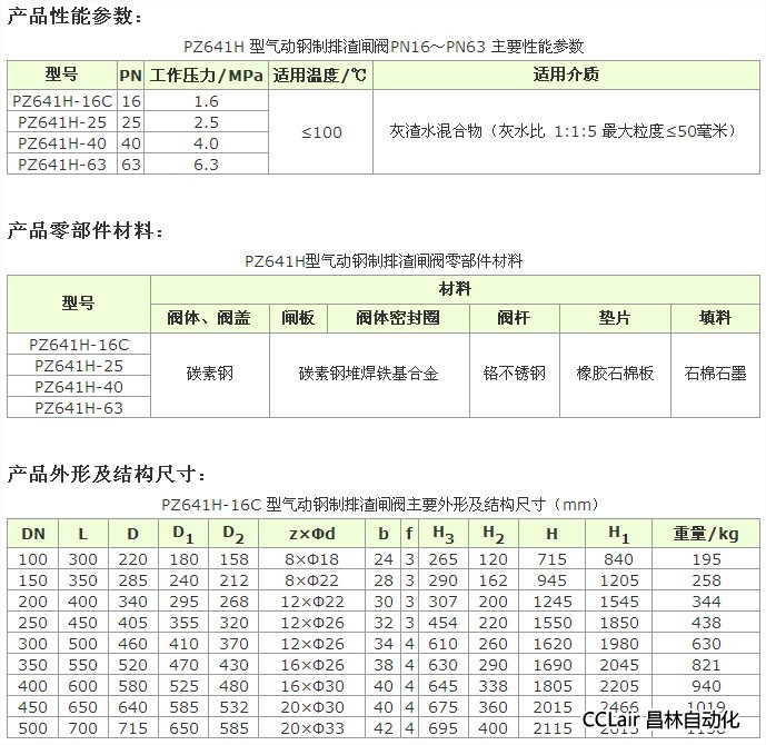 PZ641H 型氣動(dòng)鋼制排渣閘閥是氣動(dòng)、法蘭連接、明桿楔式剛性單閘板,閥座密封面材料為碳素鋼堆焊鐵基合金,公稱壓力 PN16~PN63,閥體材料為碳素鋼的排渣閘閥。