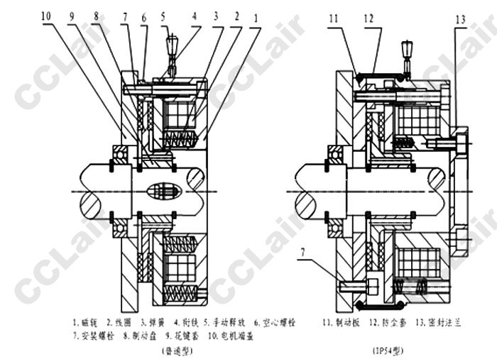 電磁失電制動器主要由勵磁部份(磁軛1、線圈2、彈簧3、銜鐵4)、制動盤8、花鍵9套等主要零部件組成。勵磁部份通過安裝螺釘7安裝在機座上,旋合安裝螺釘7調(diào)整氣隙至規(guī)定值δ后,反向旋出空心螺栓6,頂緊勵磁部份?;ń√?通過鍵與傳動軸相連;制動盤8與花健套9通過花鍵嚙合。當(dāng)線圈2斷電時,在彈簧3的作用下,制動盤8與銜鐵4、機座端面10(或制動板11)產(chǎn)生摩擦力,通過花鍵套9傳給傳動軸使軸制動。當(dāng)線圈2通電后,在電磁力作用下,銜鐵4被吸向磁軛1,使制動盤8松開,傳動軸制動解除。(設(shè)備檢修停電時,可通過軸向扳動手動釋放機構(gòu)5,使制動解除。)