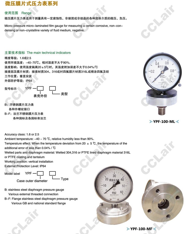 YPF-100-ML,YPF-100-MF,微壓膜片式壓力表,無錫昌林