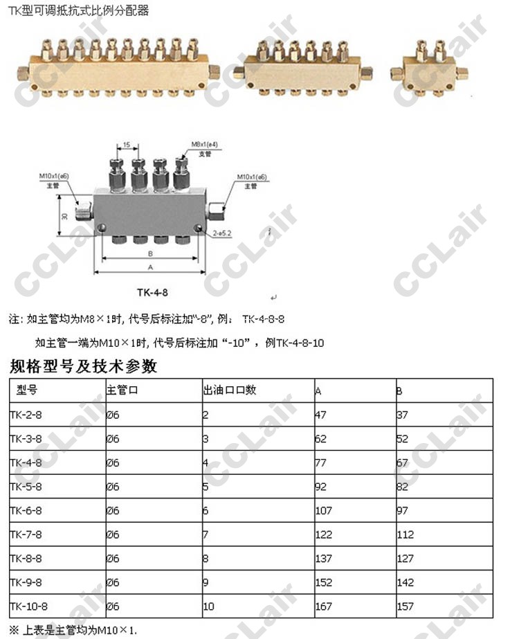 型號: TK-2-8,TK-3-8,TK-4-8,TK-5-8,TK-6-8,TK-7-8,TK-8-8,TK-9-8,TK-10-8,可調(diào)抵抗式比例分配器