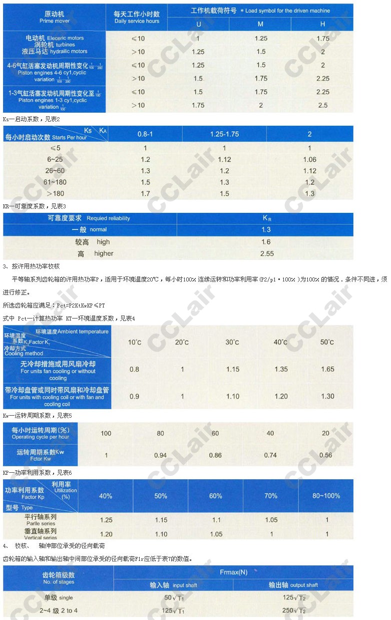 平等軸系列齒輪箱的公稱(chēng)輸入功率PA(表9—20)按載荷平穩(wěn),每天工作時(shí)間小于或等于10h,每小時(shí)啟動(dòng)不超過(guò)5次,允許啟動(dòng)轉(zhuǎn)矩為工作轉(zhuǎn)矩的2倍,單向運(yùn)轉(zhuǎn),單對(duì)齒輪的接觸強(qiáng)度安全系數(shù)約為1,失效率概率小于或等于1%等條件計(jì)算確定的。齒輪箱雙向運(yùn)轉(zhuǎn)時(shí),需視情況將PN乘上0.8—1.0的系數(shù),當(dāng)反向載荷大,換向頻繁、選用的可靠度系數(shù)KR較低時(shí),系數(shù)取較小值,反之取較大值。