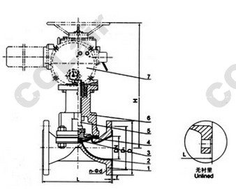 部件列表:1.閥體 2.閥體襯里 3.隔膜 4.閥瓣 5.閥桿 6.閥蓋 7、電動頭
