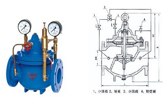 當(dāng)主閥出口壓力低于導(dǎo)閥設(shè)定的壓力時(shí),導(dǎo)閥此時(shí)處于開通狀態(tài),主閥上腔壓力與主閥出口壓力相等,進(jìn)口與吃口存在壓差,水流經(jīng)閥口出口流出,當(dāng)消防泵氣泵時(shí),或變平泵壓力升高時(shí),超過導(dǎo)閥設(shè)定壓力,由主閥進(jìn)口向?qū)чy管控制室壓力升高,作用在彈簧壓力增大,向下壓緊,帶動(dòng)閥芯下移,使導(dǎo)閥關(guān)閉,此時(shí)主閥進(jìn)口壓力通過節(jié)流閥補(bǔ)充到主閥閥蓋上腔,因閥瓣受到向下壓力大于向上推力,主閥關(guān)閉