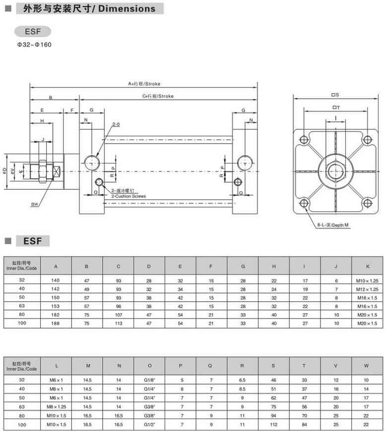 ESF-32*25-S,ESF-40*50-S,ESF-50*75-S,ESF-63*80-S,ESF-80*100-S,標(biāo)準(zhǔn)氣缸