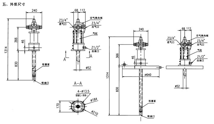 三、使用要領(lǐng) 1、本泵應(yīng)安裝在專用桶蓋上(200L桶蓋本公司另有供貨),將泵管垂直插入200L的油桶內(nèi)。 2、進(jìn)氣管路上必須配接氣源處理三聯(lián)件。 3、使用2#油脂或高稠度潤(rùn)滑油時(shí),油桶內(nèi)必須配用壓油板(本公司另有供貨)。 4、建議供氣量調(diào)定在泵工作頻率在40~50次/min范圍內(nèi)為宜,嚴(yán)禁超過60次/min使用,以免損壞內(nèi)部運(yùn)動(dòng)件。 5、排氣口配接消氣器(用戶自備,接口Z3/4)。