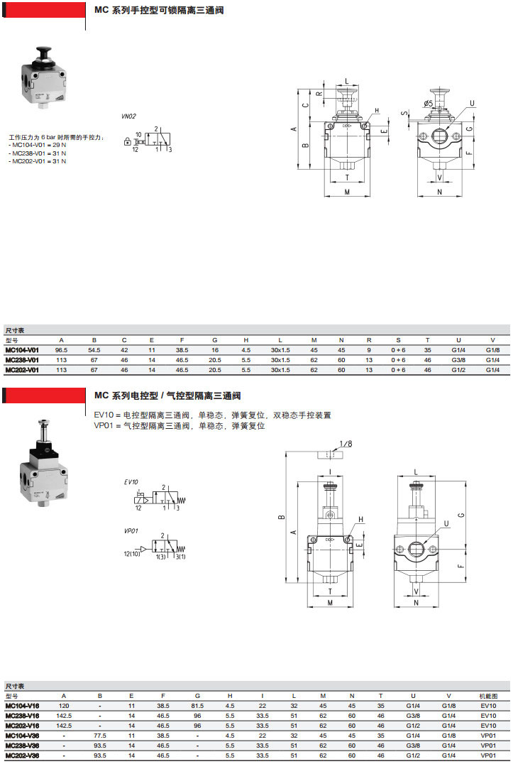MC104-V16,MC138-V16,MC102-V36,MC204-V36,MC238camozzi隔離三通閥 |