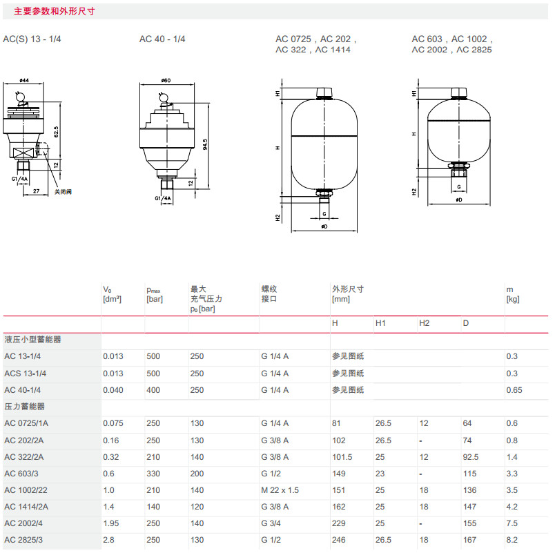 AC13-1/4,ACS13-1/4,AC40-1/4,AC0725/1A,AC202/2A,AC322/2A,蓄能器