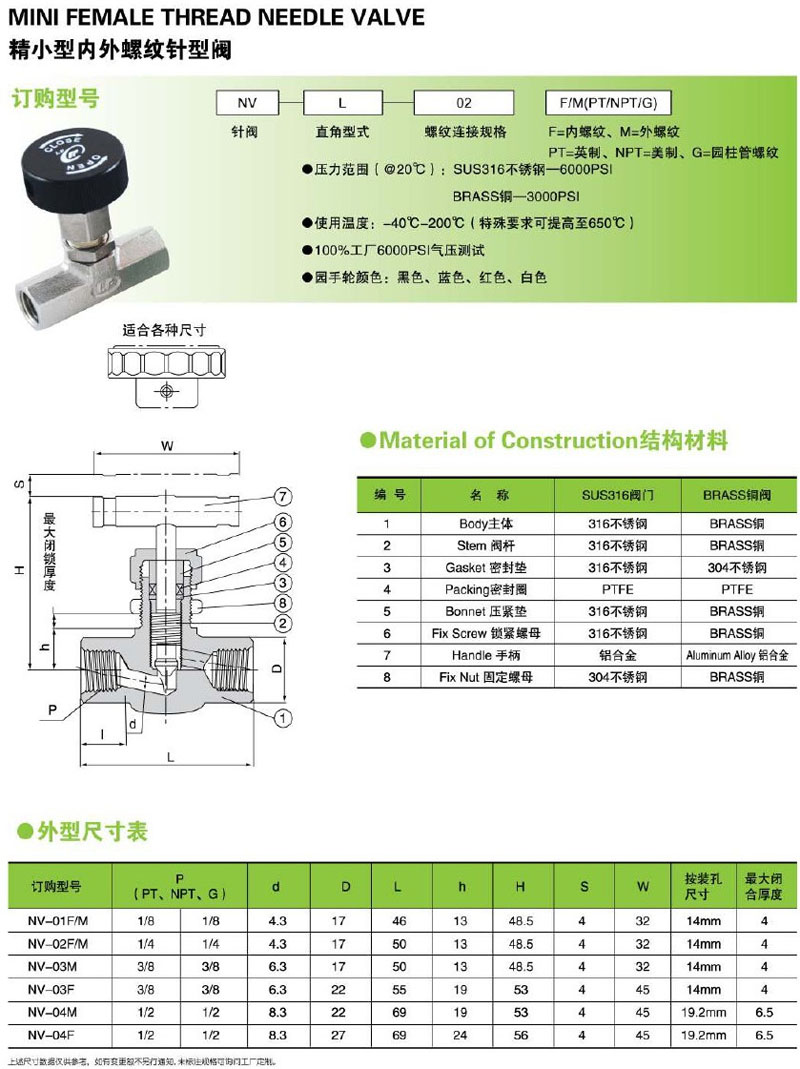 NV-01F/M,NV-02F/M,NV-03M,NV-03F,NV-04M,NV-04F,精小型內(nèi)外螺紋連接針型閥
