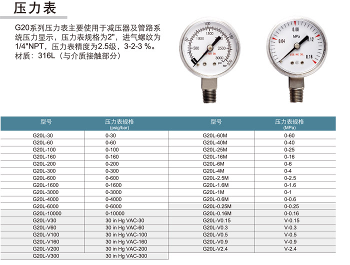 G20L-30,G20L-60,G20L-100,G20L-160,G20L-200,G20L-300,G20L-600,G20L-1600,G20L-3000,壓力表 |