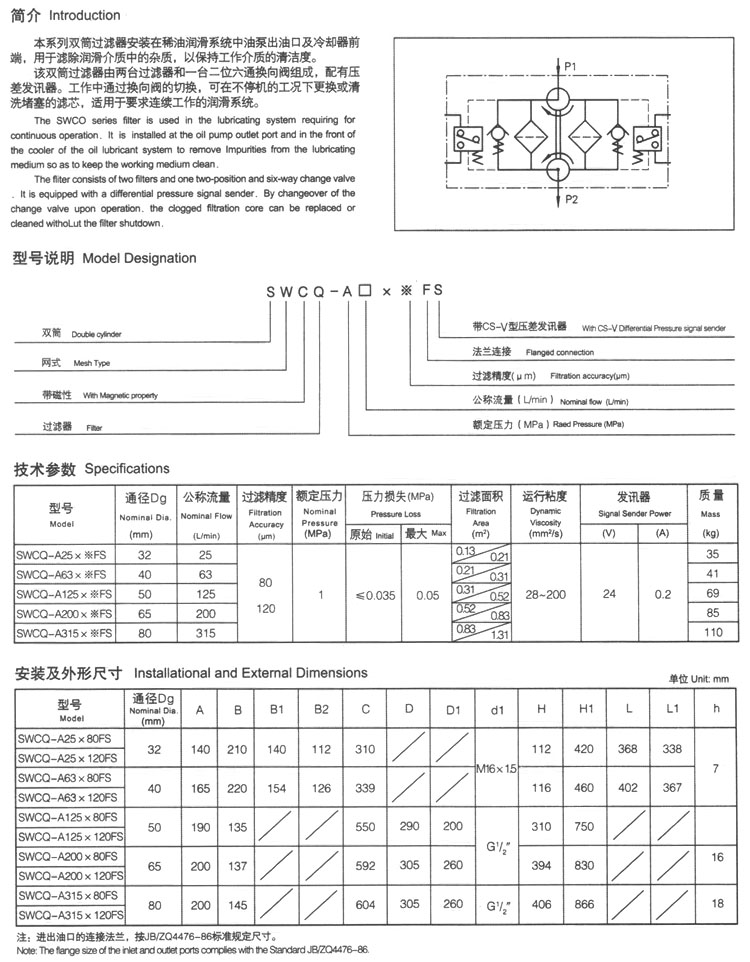 SWCQ-A25*80FS,SWCQ-A63*120FS,SWCQ-A200*80FS,SWCQ-A315*120FS,稀油潤(rùn)滑系統(tǒng)雙筒過濾器