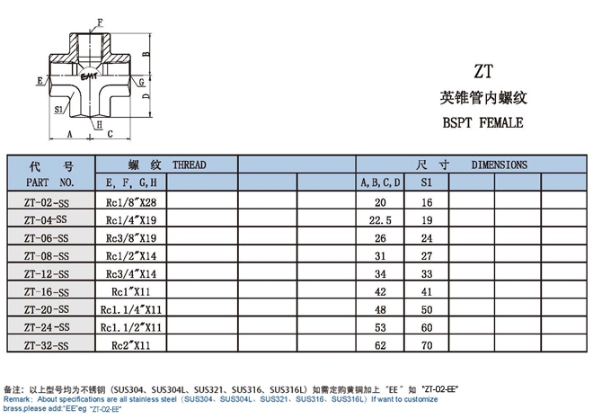 ZT-02-SS,ZT-04-SS,ZT-12-SS,ZT-24-SS,ZT-32-SS,四通內(nèi)絲接頭