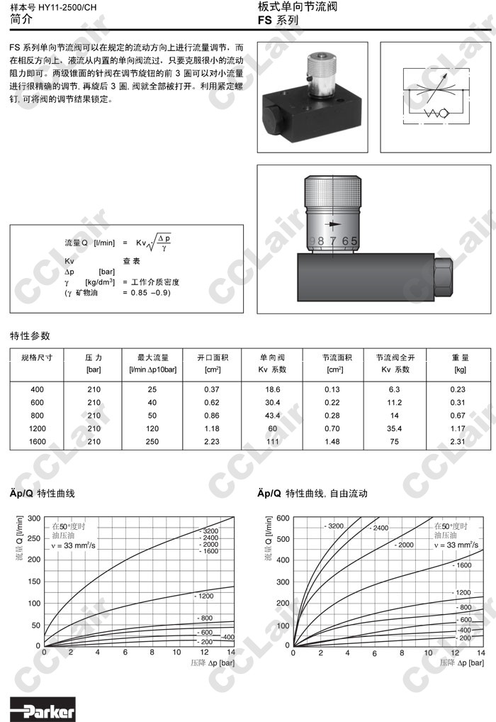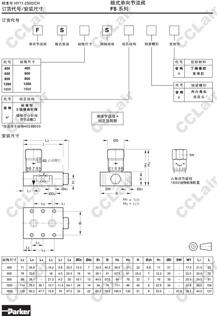 FS400S,FS400S4,FS600S,FS600S4,FS800S,FS1200S,FS1600S,FS400SV,FS400SF,FS400SFV,Parker單向節(jié)流閥