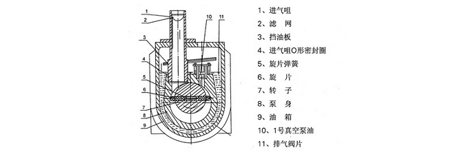 2XZ旋片式真空泵系雙級高速直聯(lián)結(jié)構(gòu)旋片式真空泵。它有偏心地裝在泵腔內(nèi)的轉(zhuǎn)子,及轉(zhuǎn)子槽內(nèi)的旋片。轉(zhuǎn)子帶動旋片轉(zhuǎn)時,旋片緊貼腔壁,把進、排氣口分隔開來,并使進氣積腔容積周期性地擴大而吸氣,排氣腔容積則周期性地縮小而壓縮氣體,推開排氣閥排氣,從而獲得真空。圖一為單級泵的工作原理示意圖。雙級是兩個單級串聯(lián)而成。