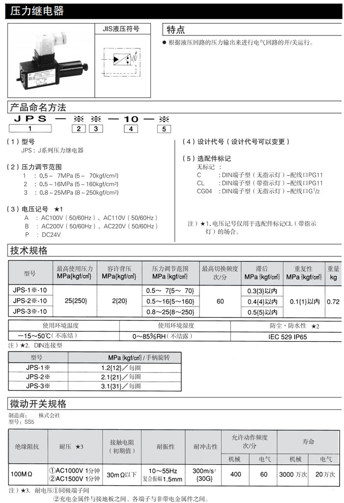 JPS-1A-10,JPS-1B-10,JPS-1P-10,JPS-2A-10,JPS-2B-10,JPS-2P-10,JPS-3A-10,JPS-3B-10,JPS-3P-10,DAIKIN壓力繼電器