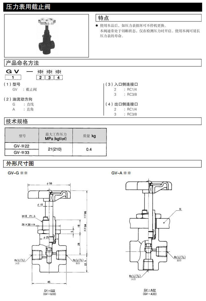 GV-G22,GV-A22,GV-G33,GV-A33,DAIKIN壓力表用截止閥