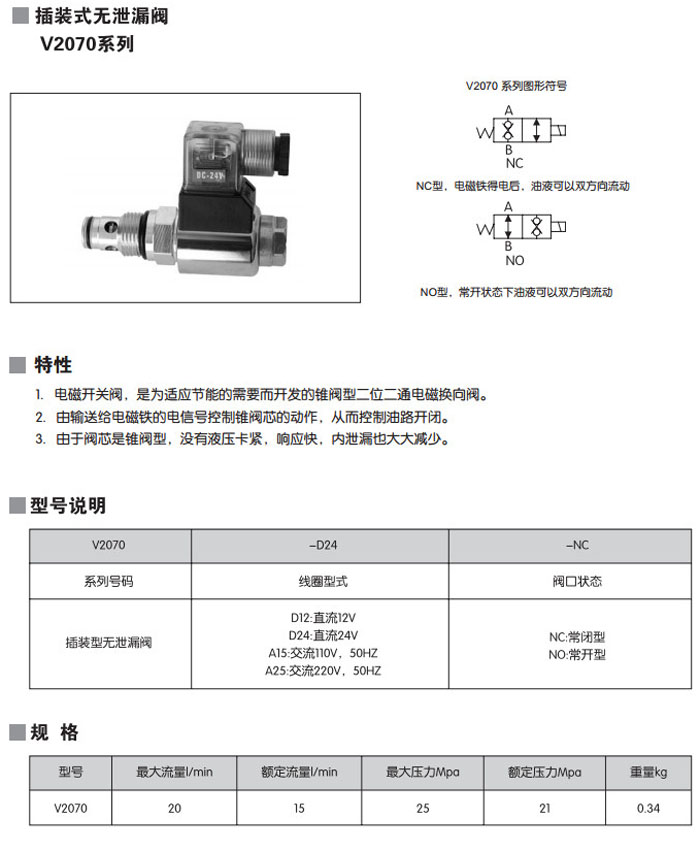 V2070-D24-NC,V2070-D24-NO,V2070-D12-NC,V2070-D12-NO,V2070-A15-NC,V2070-A15-NO,插裝式無(wú)泄漏閥
