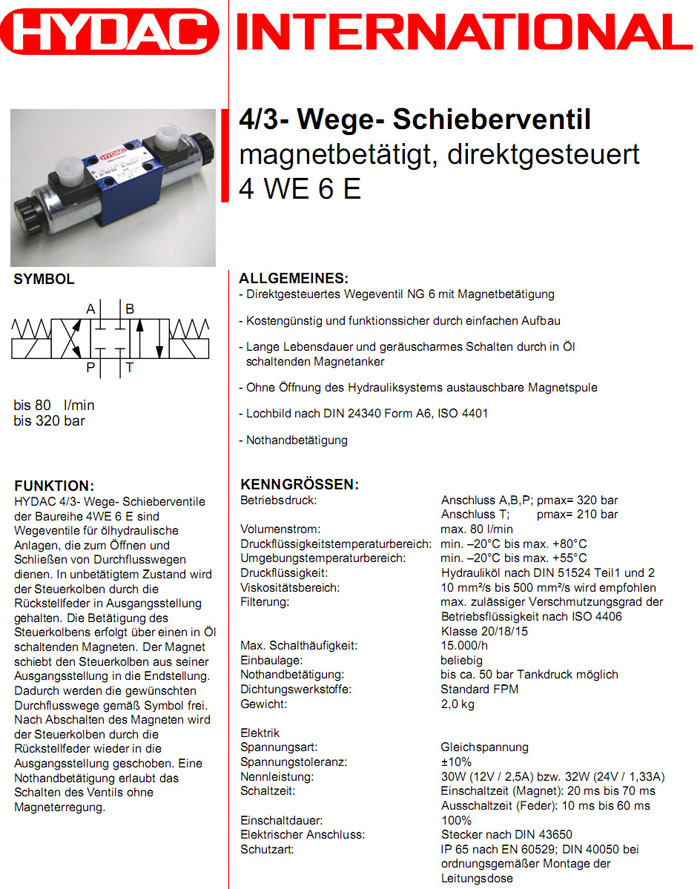 4WE6ES01-12DG/V,4WE6ES01-24DG/V,HYDAC電磁4/3方向滑閥