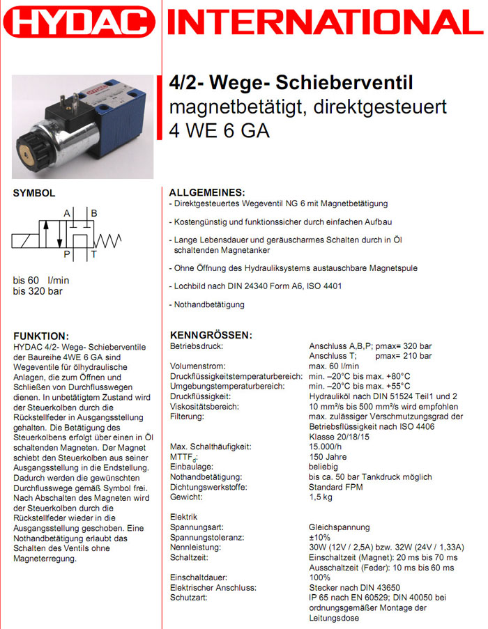4WE6GAS01-12DG/V,4WE6GAS01-24DG/V,HYDAC電磁4/2方向滑閥
